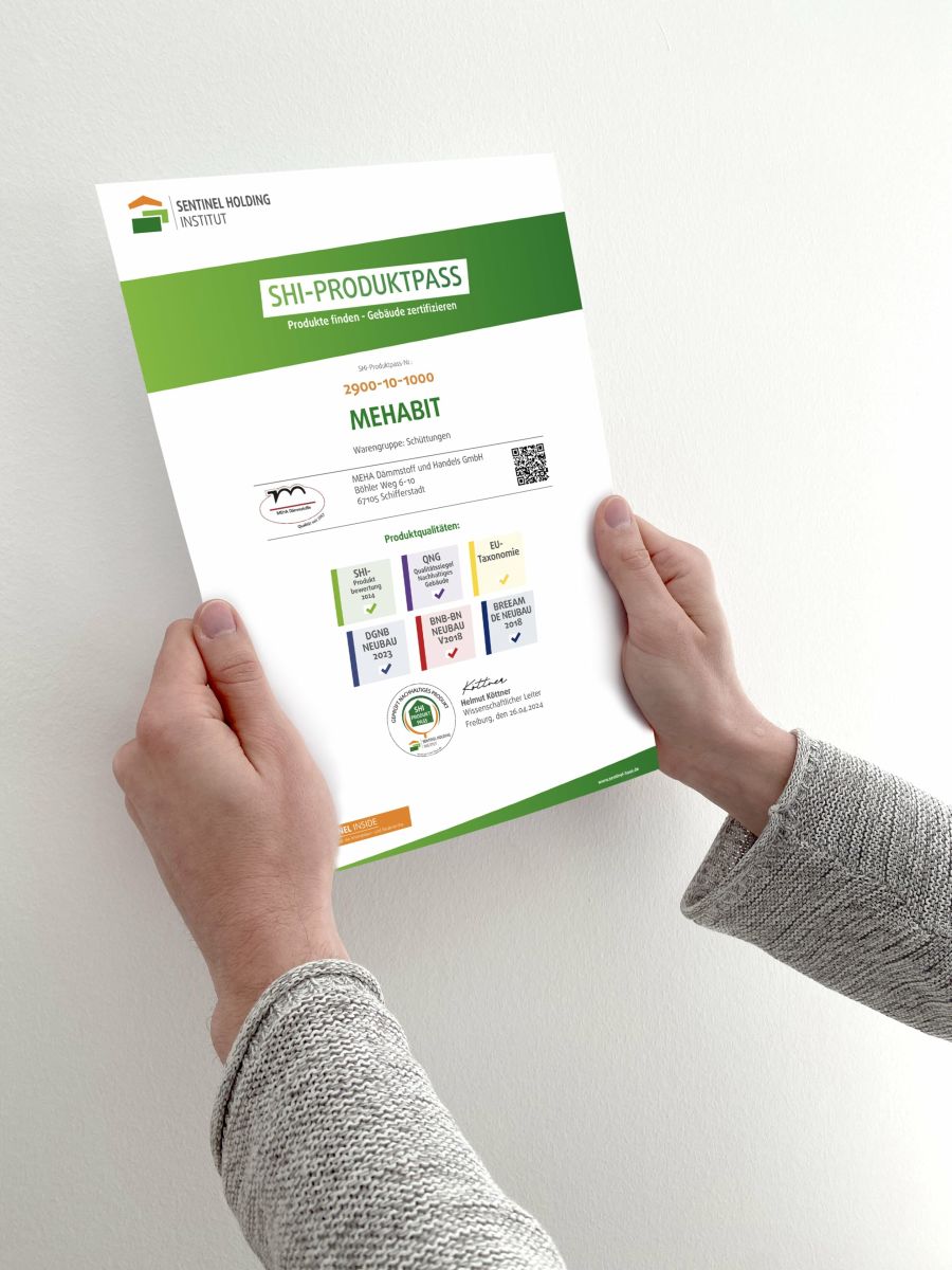 Durch die Auszeichnung mit dem SHI-Produktpass zur umfassenden Nachhaltigkeitsprüfung für MEHABIT und MEHASPORT, legen wir einen weiteren Baustein mit dem Ziel „wohngesund zu bauen“. Unsere Trockenschüttungen stehen für Nachhaltigkeit und Kreislauffähigkeit und das seit Jahrzehnten!